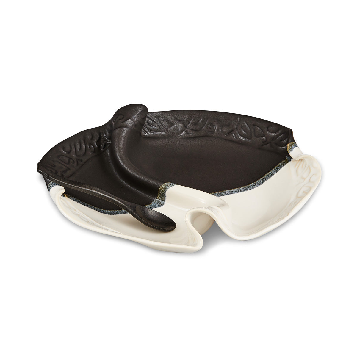 Comes with a rosewood spoon. As with all of our pottery, it is oven, dishwasher and microwave proof as well as food and drink safe.