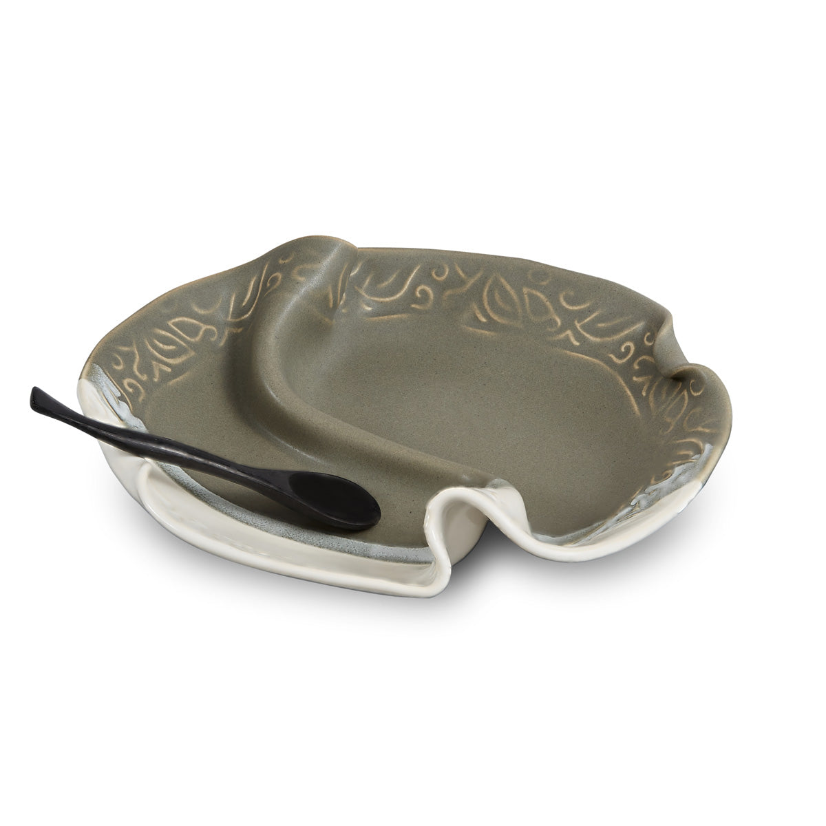 Comes with a rosewood spoon. As with all of our pottery, it is oven, dishwasher and microwave proof as well as food and drink safe.