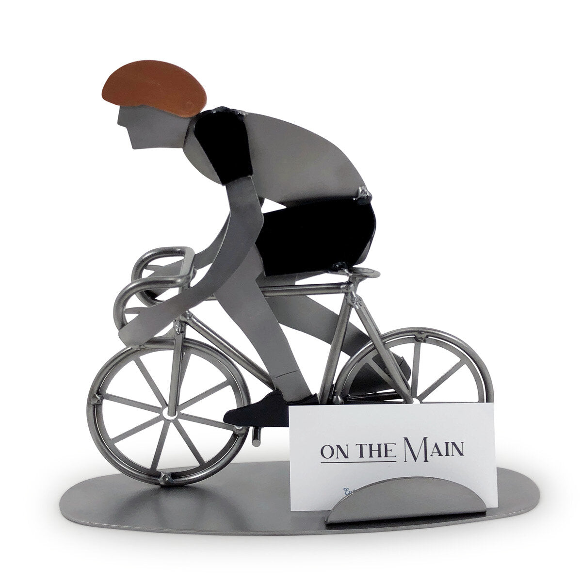 This Bicycle Rider metal sculpture is the perfect Business Card Holder and gift for any cycling enthusiast. The unique style of this fine crafted work is a whimsical addition to any home or office.