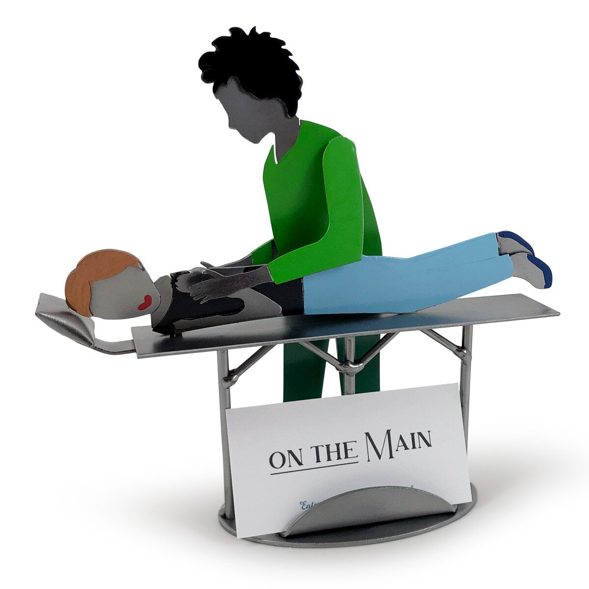 This Chiropractor / Masseuse metal sculpture is the perfect Business Card Holder. This uniquely whimsical, finely crafted art work is a fun addition to any professional’s home or office. Please, take a card holder…