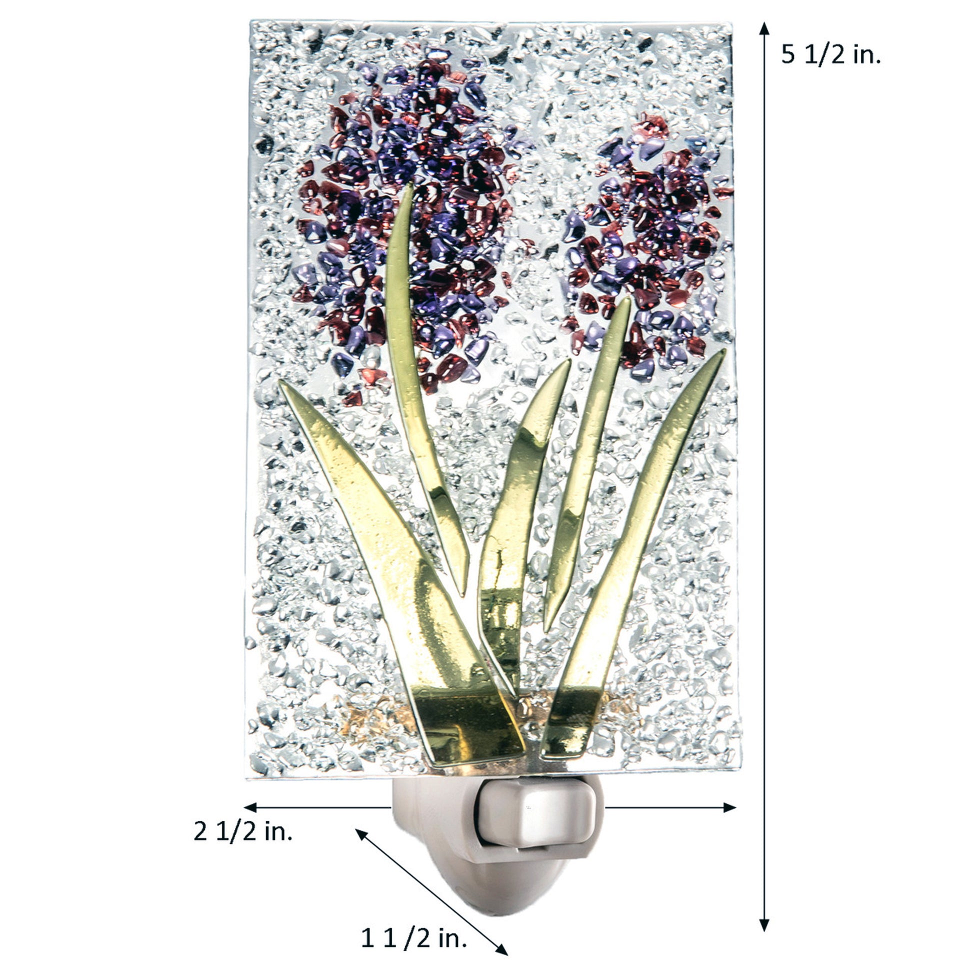 This decorative wall plug in night light features shades of purple stained glass surrounded by clear chips and heat fused onto a a clear background. Night light comes complete with base and 4 watt bulb. Works with wall socket shown in the photos.