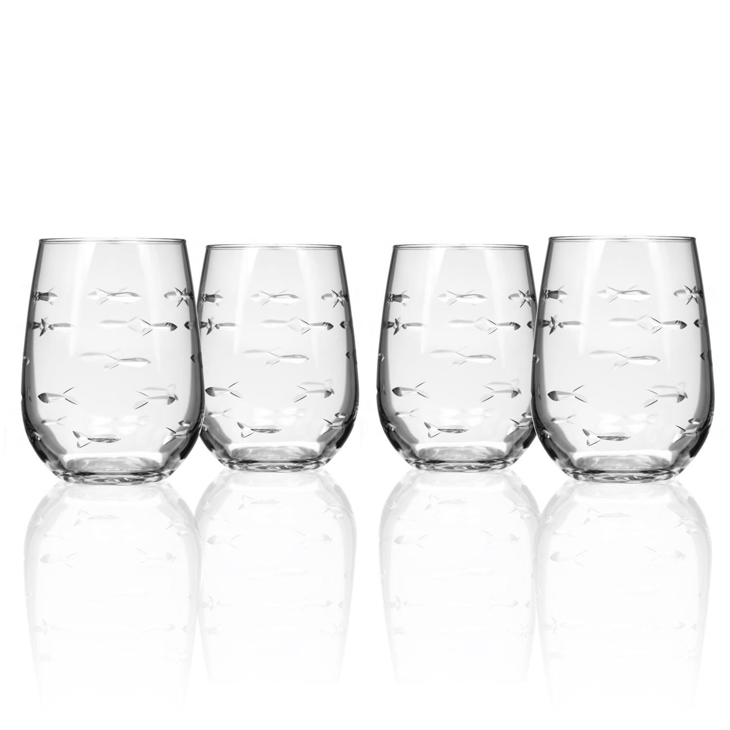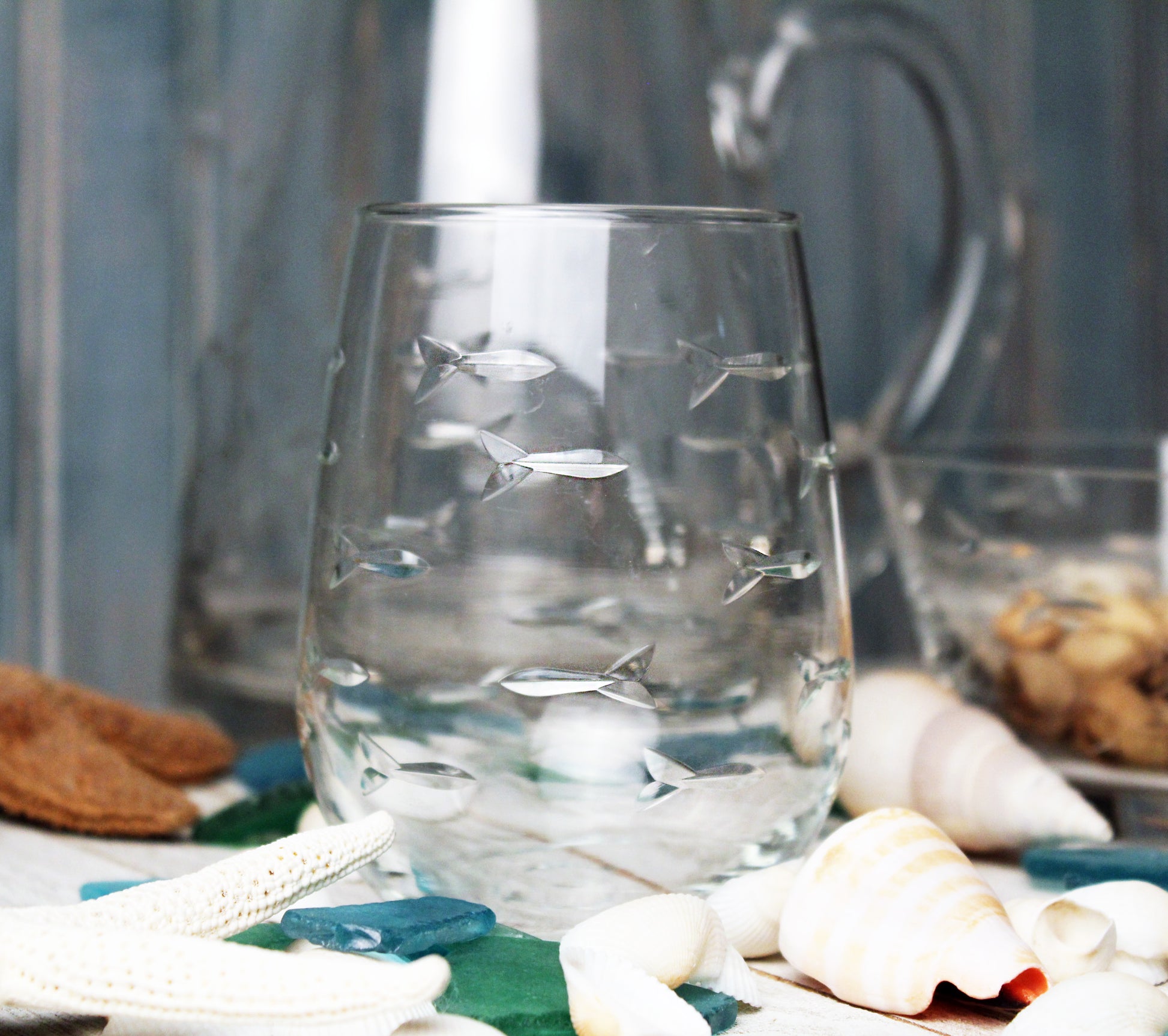 Poolside or fireside, enjoy a great glass of your favorite beverage in this 17oz diamond-engraved universal stemless red wine glass. This playful School of Fish design never gets old. Whatever creative fish story you tell your friends you will get a delightful reaction when they discover the wayward fish. Each piece in this glassware collection has subtle differences that unite the collection without mimicking the exact same design. Made from excellent quality glass. Diamond-wheel engraved, this unique glassware makes a wonderful gift.