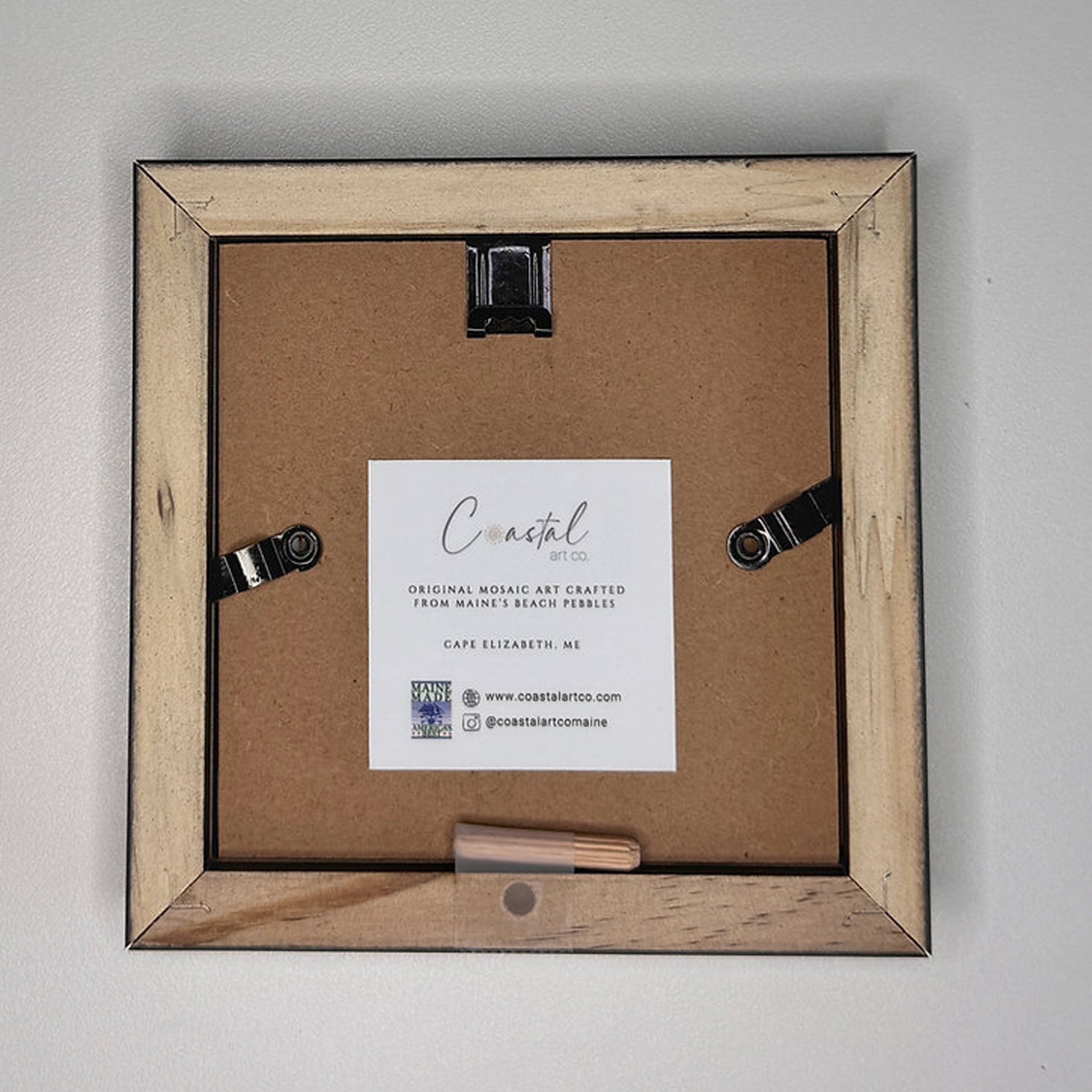 Bring a touch of coastal Maine into your home with this one-of-a-kind mini mosaic seagull bird. Handcrafted with locally sourced pebbles gathered from Maine’s beaches and coves, each piece captures the rugged beauty of the shoreline. Set in a sleek 4x4 black compressed wood frame, this design makes a perfect accent for a desk, shelf, or gift for a seagull bird lover. Every mosaic is created one pebble at a time, ensuring no two are ever alike.