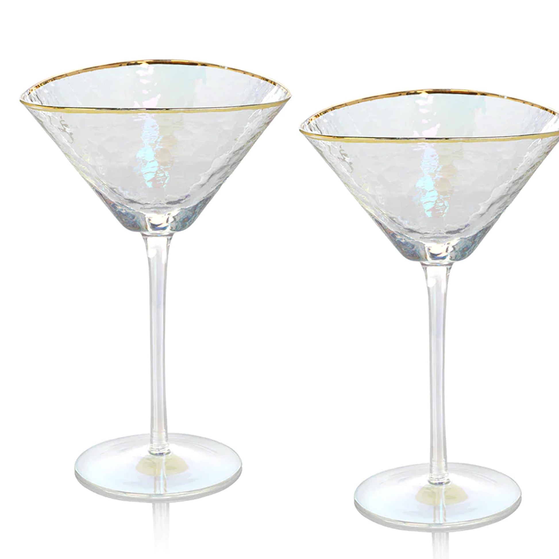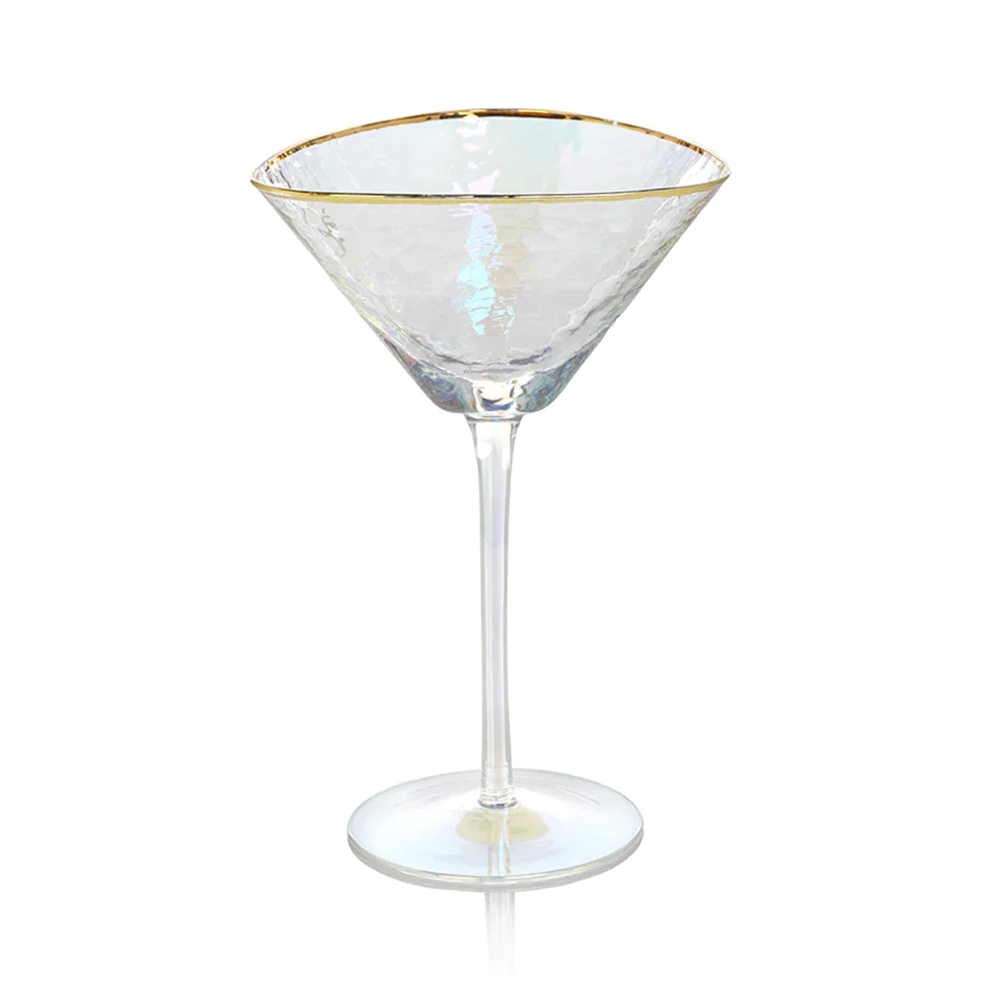 I'll have a Martini and make that iridescent please. These beautiful triangular shaped iridescent glasses are hand hammered with gold metalic rims. Sure to elevate your martini experience to another level! Celebrate life with a freind, take two!