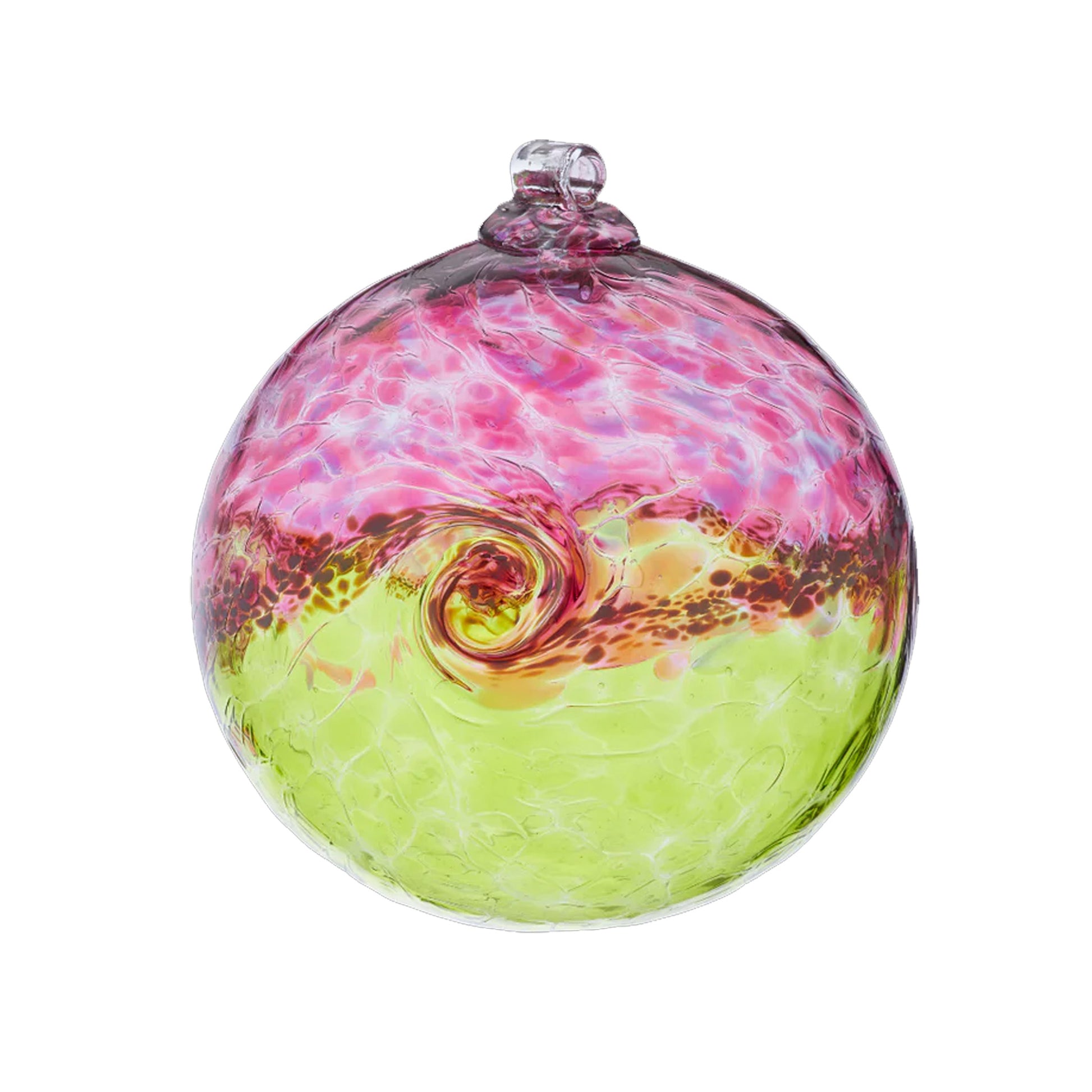 Cranberry and Lime dance together in these handblown ornaments inspired by the swirling sky of Vincent Van Gogh's famous painting “The Starry Night.” During the making process, a line of opaque white glass is swirled across the middle, mixing with the two colours on the surface, creating the image of air currents or rolling waves.