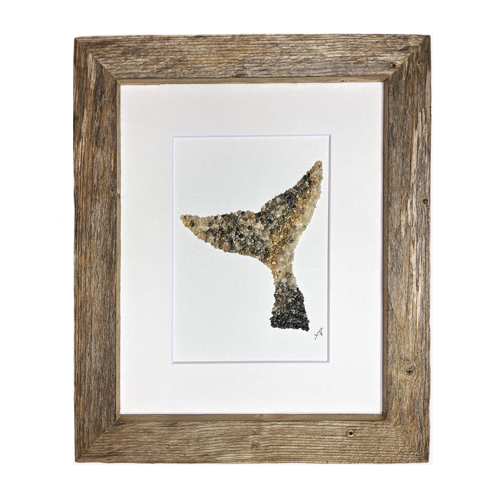 This stunning handcrafted mosaic pebble art whale tail home decor is made in Maine from local beach pebbles and stones. The custom barn wood flat frame is made from recycled wood, adding an eco-friendly touch to this one-of-a-kind piece. Hang it on your wall as a stunning statement piece or give it as a thoughtful gift to a loved one. This pebble art whale tale is not only beautiful, but it also supports local artisans and sustainability. *See frame descriptions below.